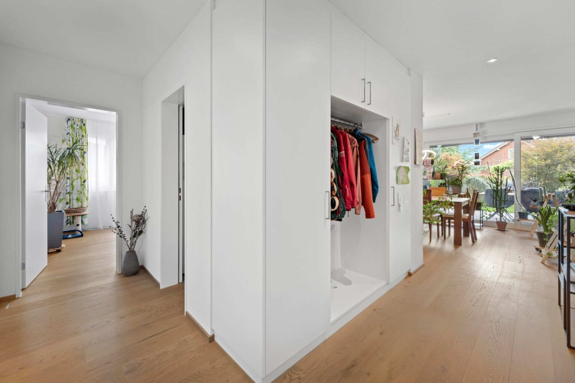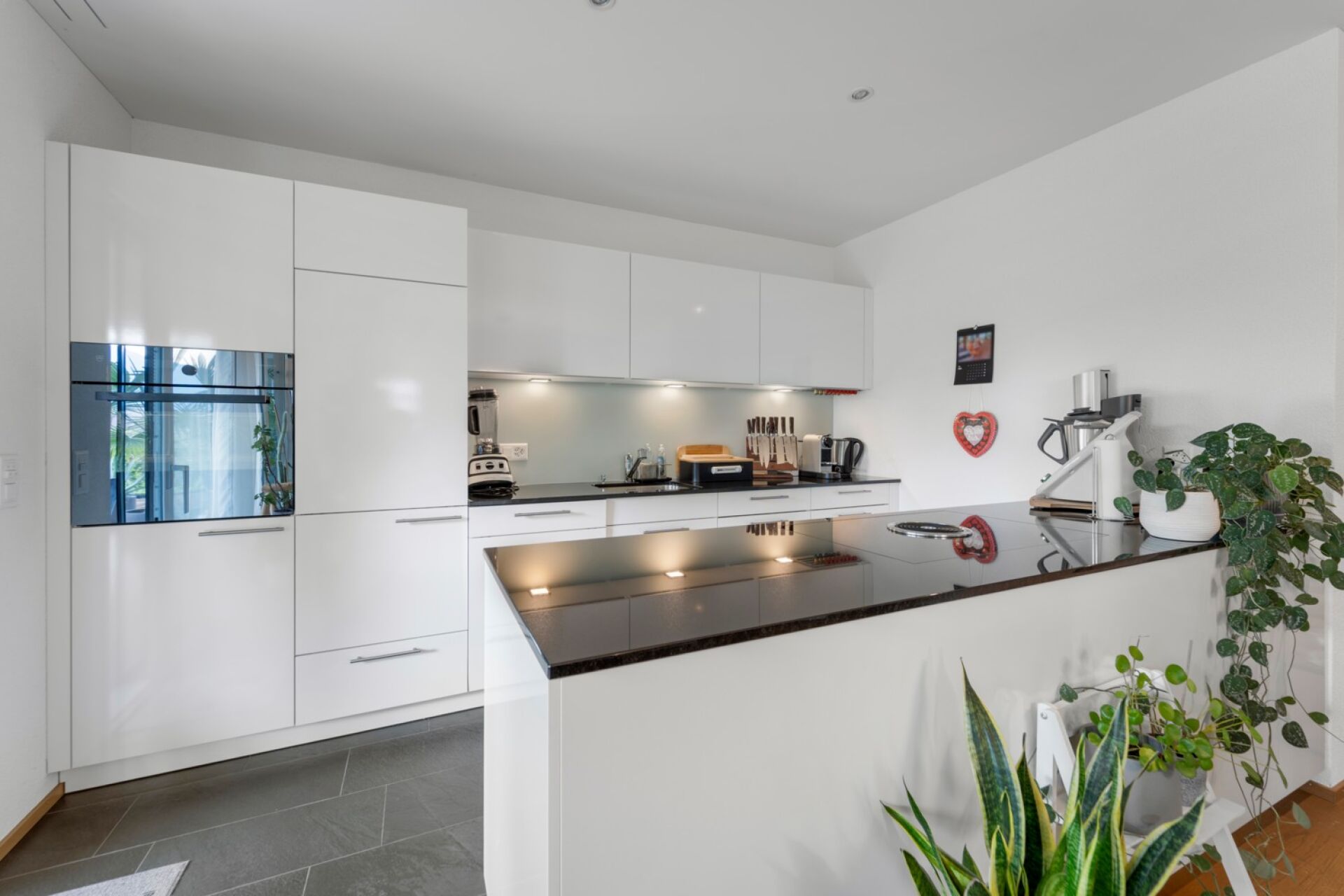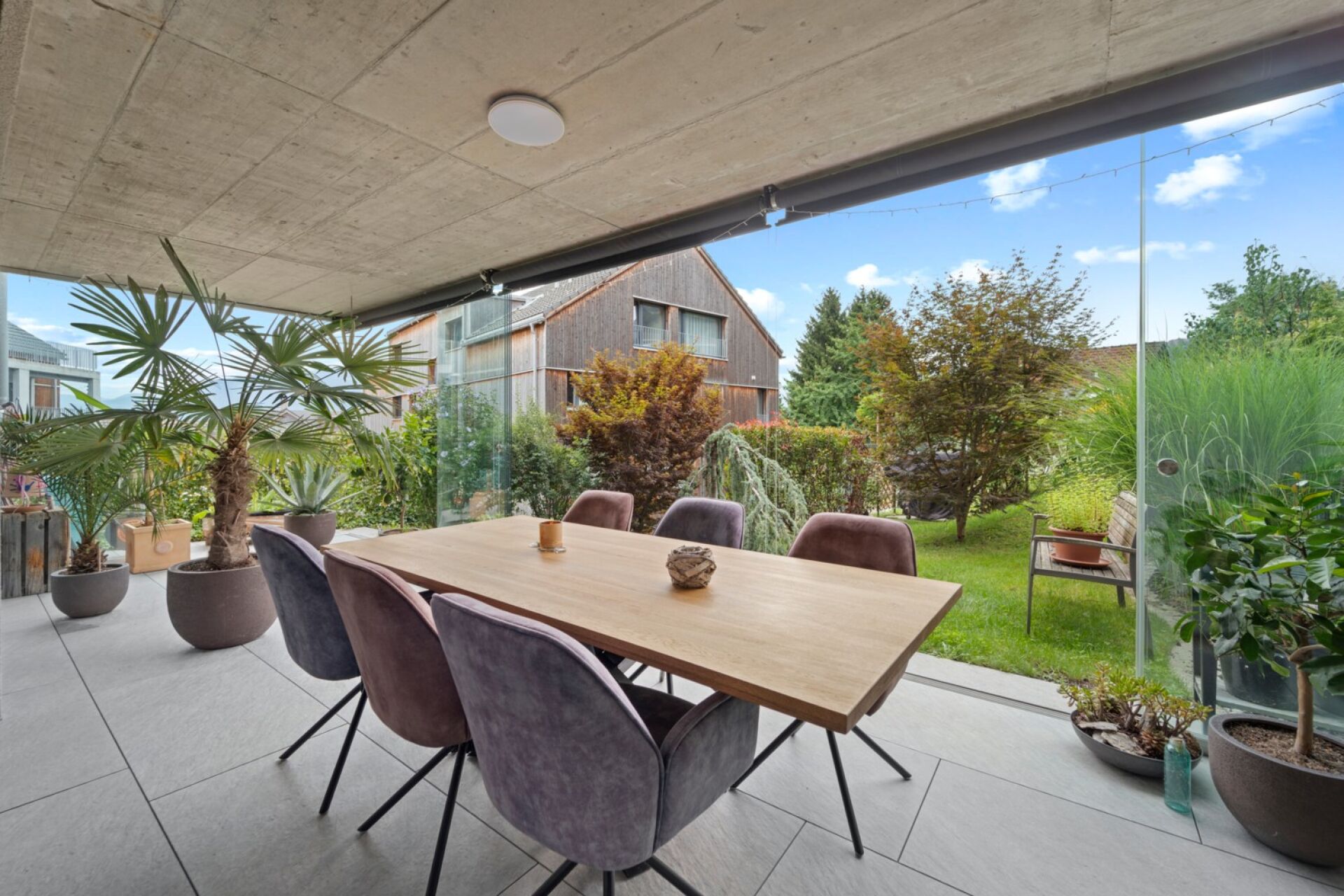 In der beeindruckenden 3 1/2-Zimmer-Wohnung im Erdgeschoss erwartet Sie ein offener, heller Wohn- und Essbereich mit einer modernen Küche. Grosse Fensterfronten lassen viel Tageslicht herein und schaffen eine freundliche Atmosphäre.
